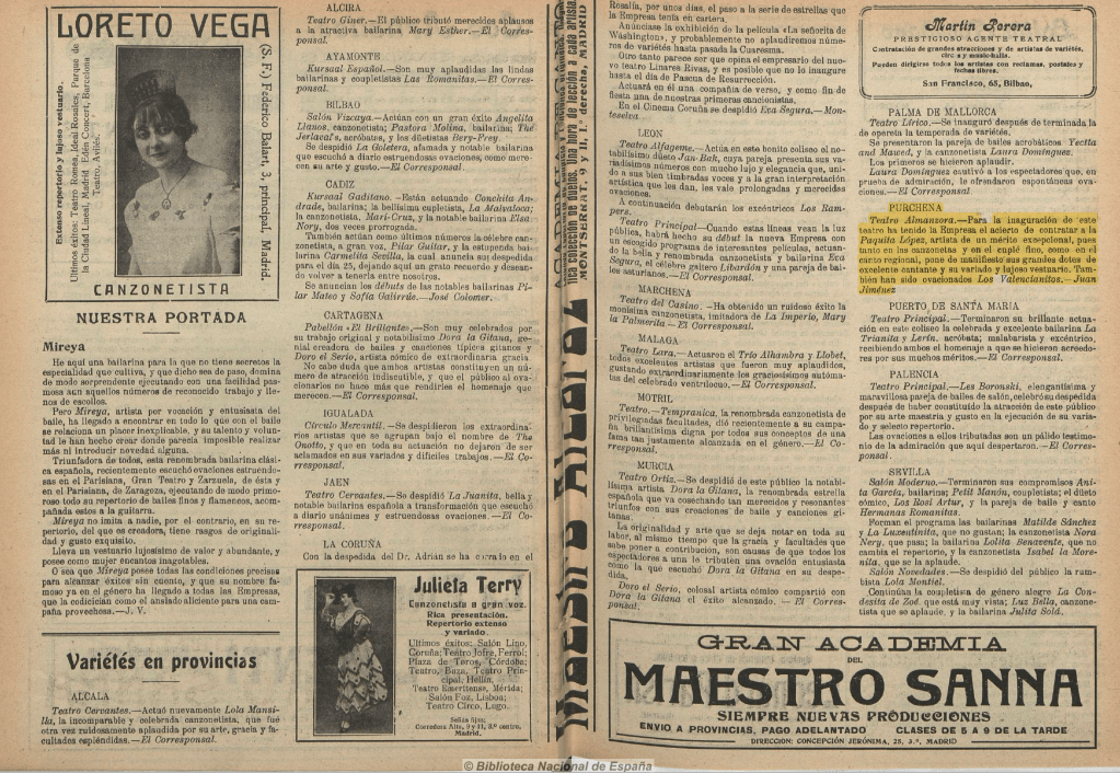“Fél nyolckor jótékonysági fogadás a gyönyörű és figyelemre méltó Paquita López tiszteletére, aki kiemelkedő értékű művész, kiváló énekes és fényűző jelmezeket visel. Varázslatos a canzoneta-k és cuplé fino-k terén, valamint a népdalok éneklésében is.