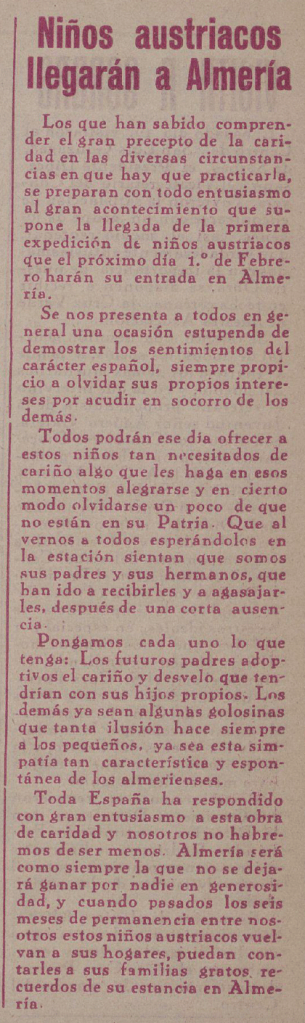 On 14 January 1950, the convoy of the seventh expedition of Austrian children arrived in Irún. More people waiting outside helped them down the tall metal stairs, and soon they entered a large hall where all kinds of fruit and strange food were laid out on large round tables with white tablecloths.