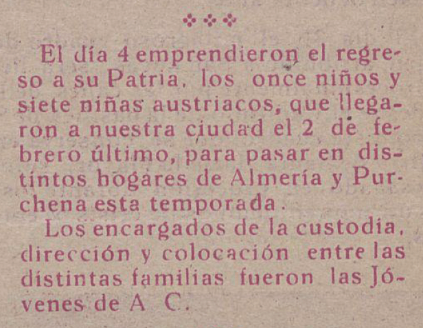 Pe 14 ianuarie 1950 convoiul celei de-a șaptea expediții de copii austrieci a sosit în Irún. Mai multe persoane care așteptau afară i-au ajutat să coboare scările înalte de metal și, în curând, au intrat într-o sală mare, unde tot felul de fructe și mâncăruri ciudate erau așezate pe mese rotunde mari, cu fețe de masă albe.